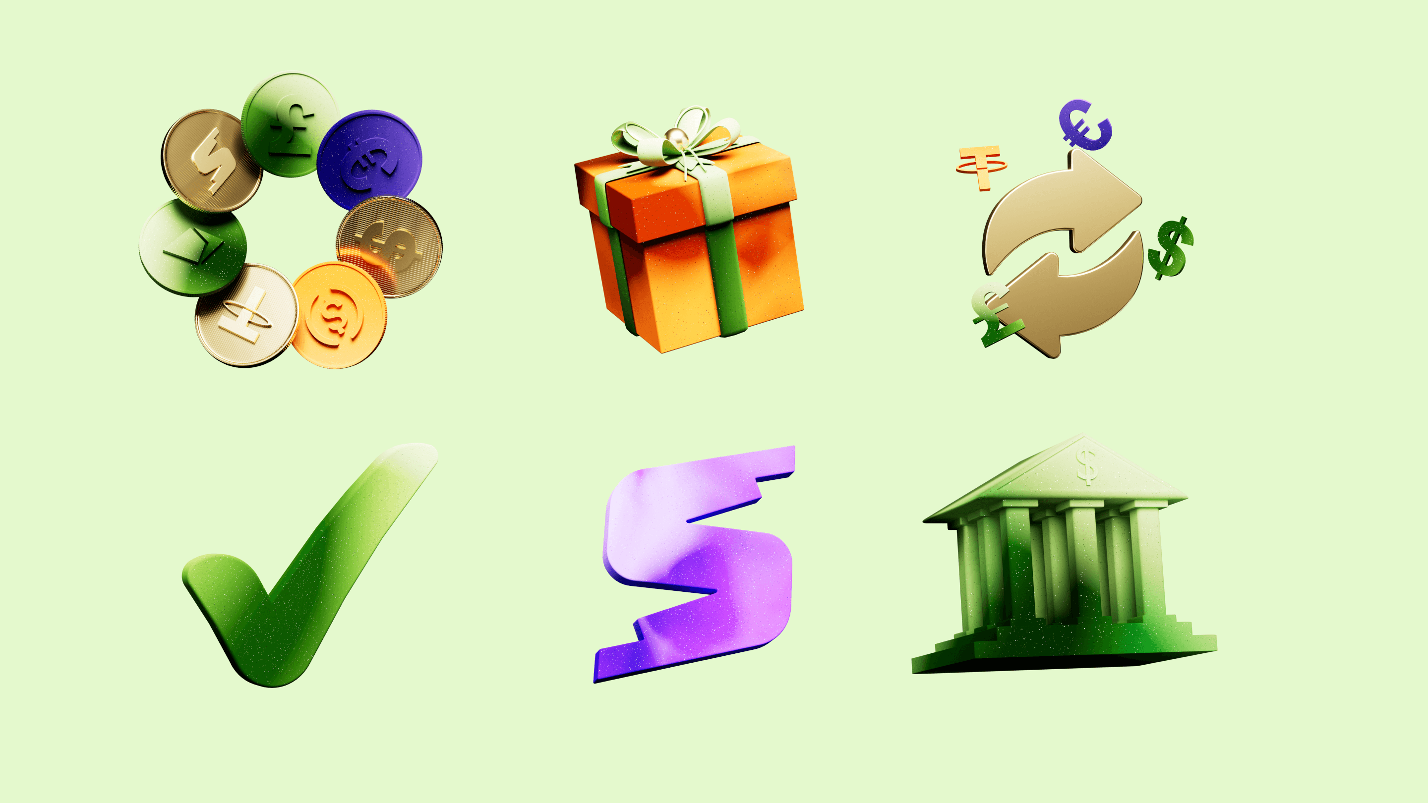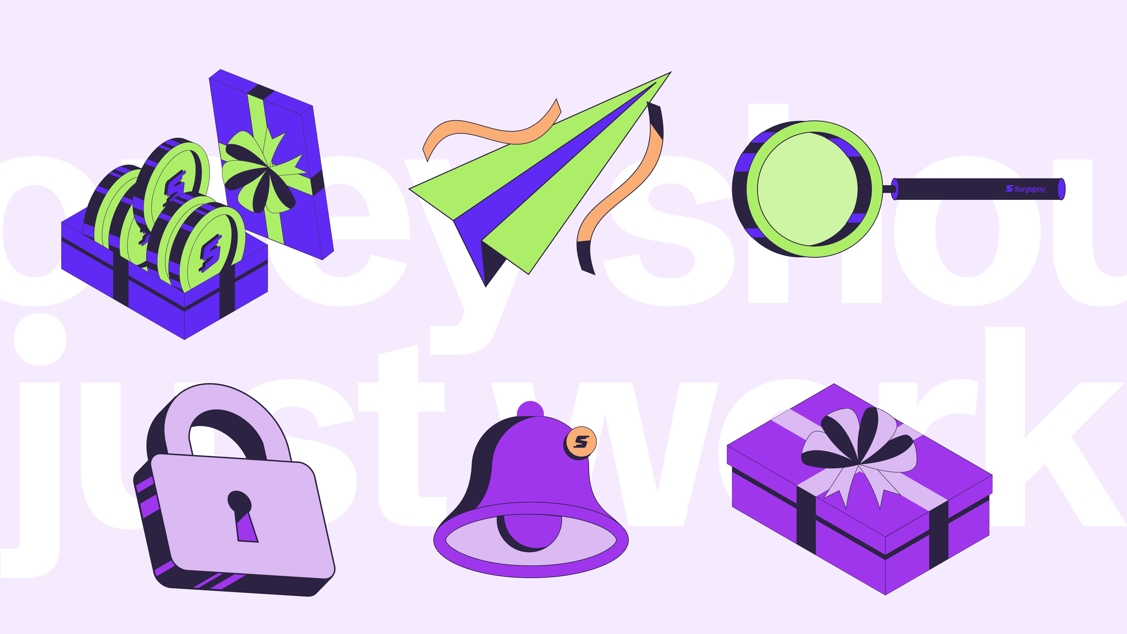 3D assets reinforce the brand's modern infrastructure. Currency coins, financial institutions (in both purple and jade), checkmarks (green and purple), gift boxes (orange and purple), umbrellas, piggy banks, and pins create a comprehensive visual system. The dimensional approach differentiates SurgePay and matches the platform's stablecoin-powered technology.